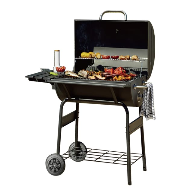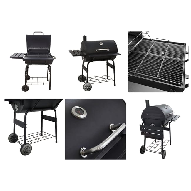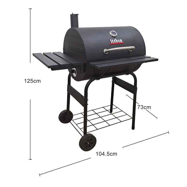 Barbacoa americana de carbón y leña, recomendada para 10 comensales. Fabricada en acero de alta resistencia para poder trabajar también con leña. Es una barbacoa horno por lo que se puede cocinar todo tipo de productos que se hacen también en horno. El recipiente de las brasas son regulables en altura con el fin de hacer excelentes asados en su punto. Posee dos áreas de cocinado y tiene un diseño en forma de barril con tapadera que permite tener un control de la temperatura. Dispone de dos ruedas para facilitar su transporte y además se limpia con gran facilidad gracias a su doble fondo. Medidas: 104,5 x 125 x 73 cm (ancho x alto x fondo).