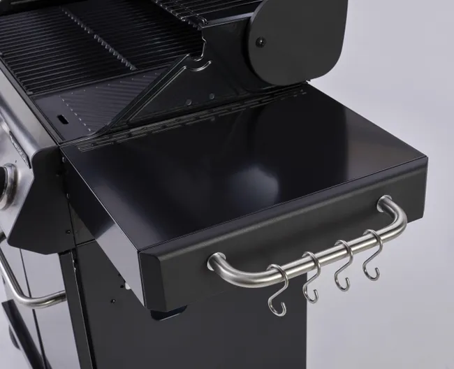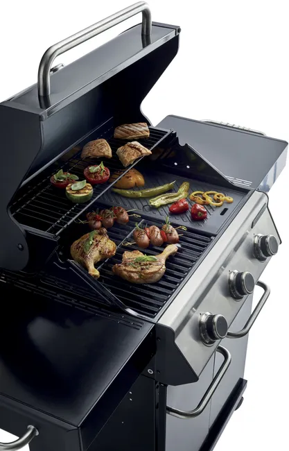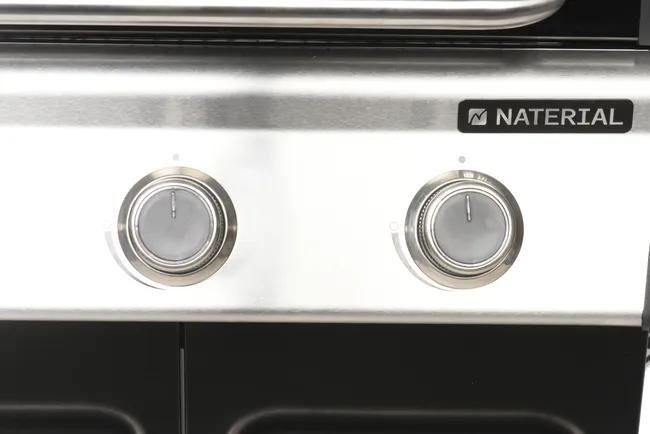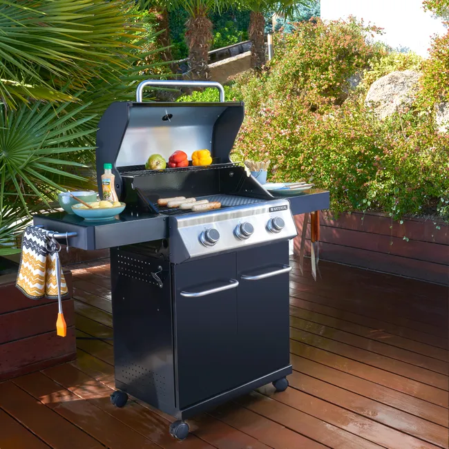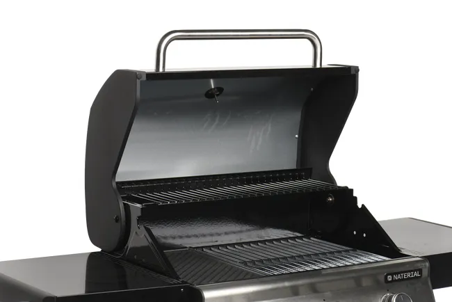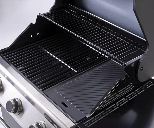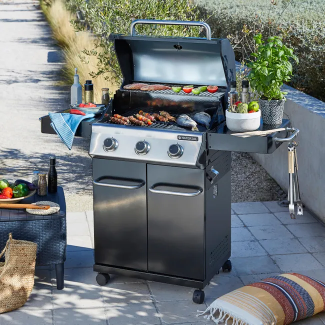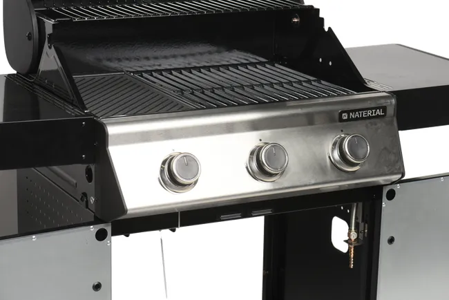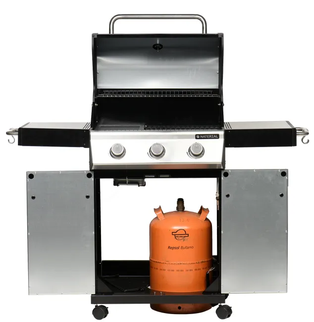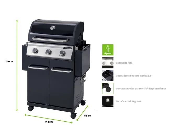 Barbacoa de gas Naterial 3B Kenton con función de grill y plancha, recomendada para 6 comensales, fabricada en acero esmaltado y texturizado de color negro con encendido piezoeléctrico. Cuenta con 3 quemadores en acero inoxidable de 10,5 kW y parrillas de hierro fundido. Incluye plancha de 41,5 x 24 cm (largo x ancho), carro con ruedas para facilitar su transporte y tapa de cocción de acero esmaltado y galvanizado. También dispone de termómetro integrado y portabotellas de gas en el interior. Además podrás disfrutar de 2 mesas abatibles para poder poner los productos y facilitar el manejo y 3 ganchos para tener a mano los utensilios de cocina. Incluye también un apartado frontal para especias, chimenea esmaltada, bandeja recogegrasas extraíble y parrilla superior de recalentamiento. Es ideal para disfrutar de tus mejores parrilladas al aire libre con todo lujo de accesorios y detalles. Ofrece 3 años de garantía. Medidas de la barbacoa: 142,5 x 114 x 55 cm (largo x alto x ancho). Medidas de las parrillas: 41,5 x 37 cm (largo x ancho).