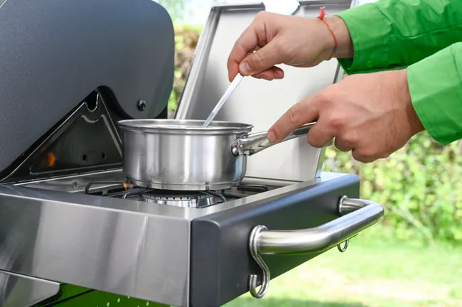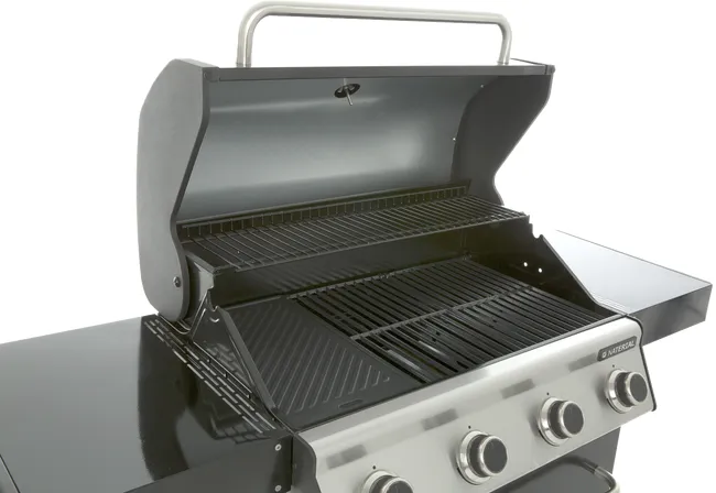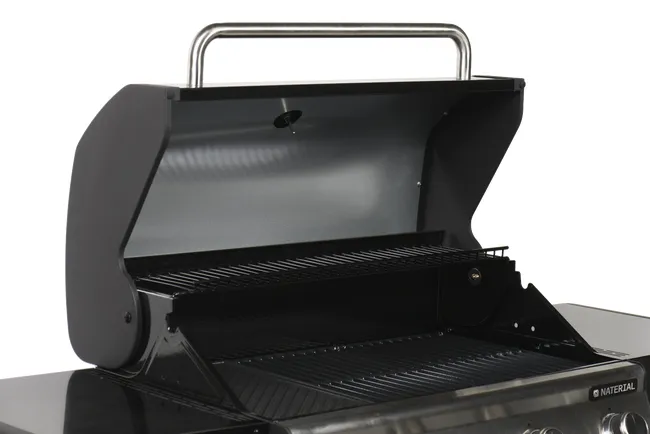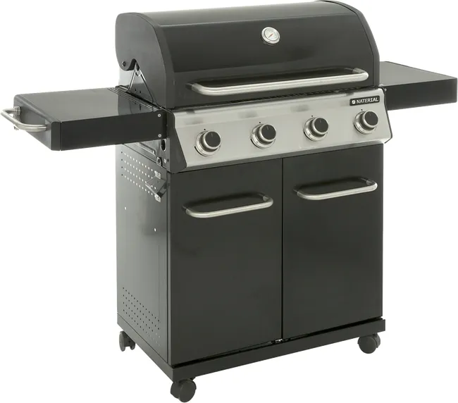 Barbacoa de gas Naterial 4B Kenton con función de grill y plancha, recomendada para 10 comensales. Está fabricada en acero esmaltado y texturizado de color negro con encendido piezoeléctrico. Cuenta con 4 quemadores en acero inoxidable de 10,5 kW y parrillas de hierro fundido con acabado brillante. Incluye una plancha de 41,5 x 24 cm (largo x ancho), carro con ruedas para facilitar su transporte y tapa de cocción de acero esmaltado y galvanizado con termómetro incorporado para saber en cada momento la temperatura a la que estás cocinando. También dispone de termómetro integrado, portabotellas de gas en el interior, 2 mesas abatibles laterales para poner los productos y facilitar el manejo y 3 ganchos para tener a mano los utensilios de cocina. Incluye además chimenea esmaltada, bandeja recogegrasas extraíble para facilitar la limpieza y parrilla superior de recalentamiento. Ideal para grandes reuniones gracias a su amplia superficie. Ofrece 3 años de garantía. Medidas de la barbacoa: 153,6 x 114 x 55 cm (largo x alto x ancho). Medidas de las parrillas: 48 x 41,5 cm (largo x ancho).